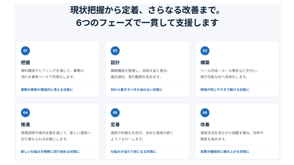 キャッチコピーの「全部やる」とは、業務の現状把握から課題整理、仕組みづくり、現場への定着、その後の改善サイクルの立ち上げまでを一貫して担うということです。戦略だけ・実装だけで終わらせず、改善が定着するところまで責任を持ちます。